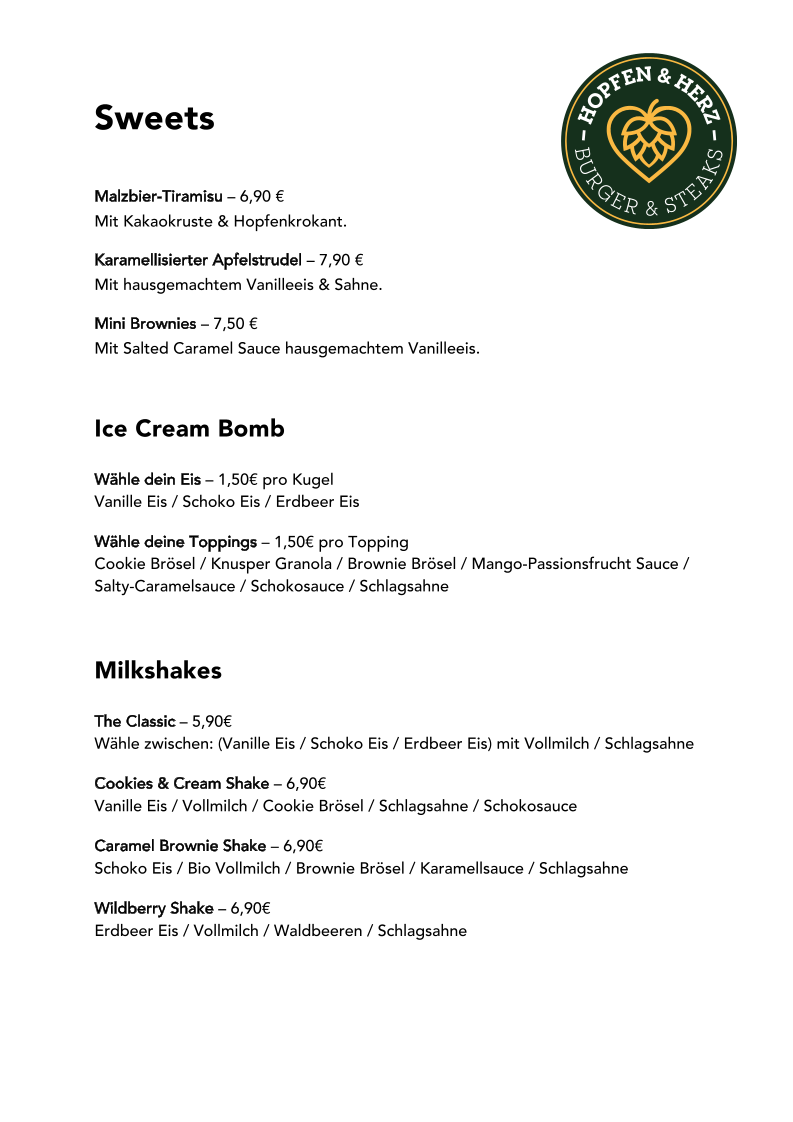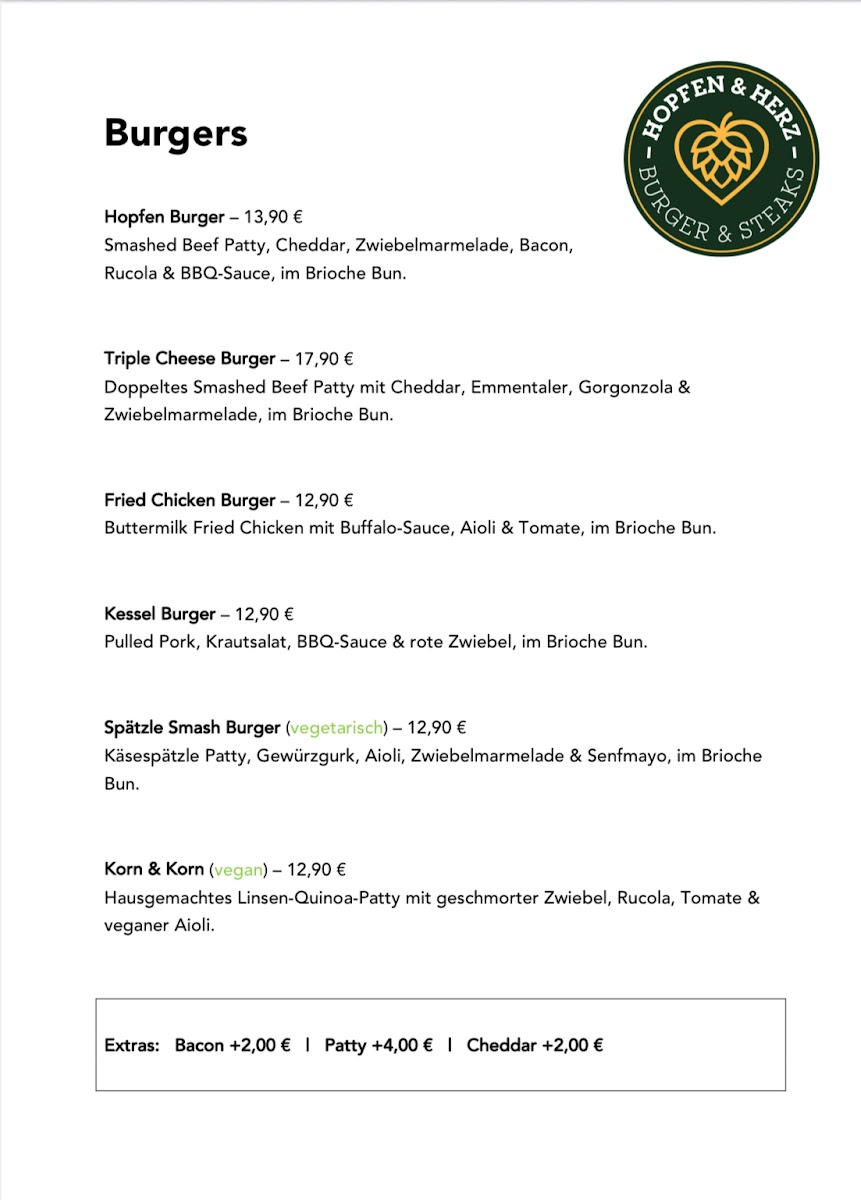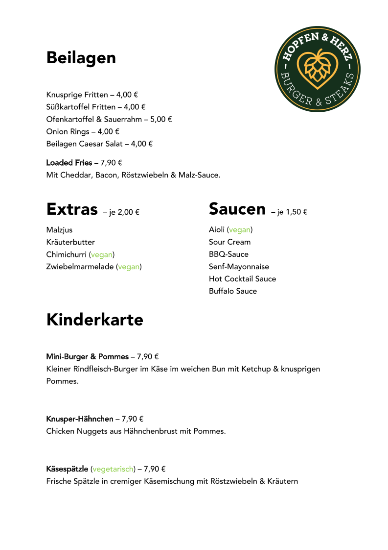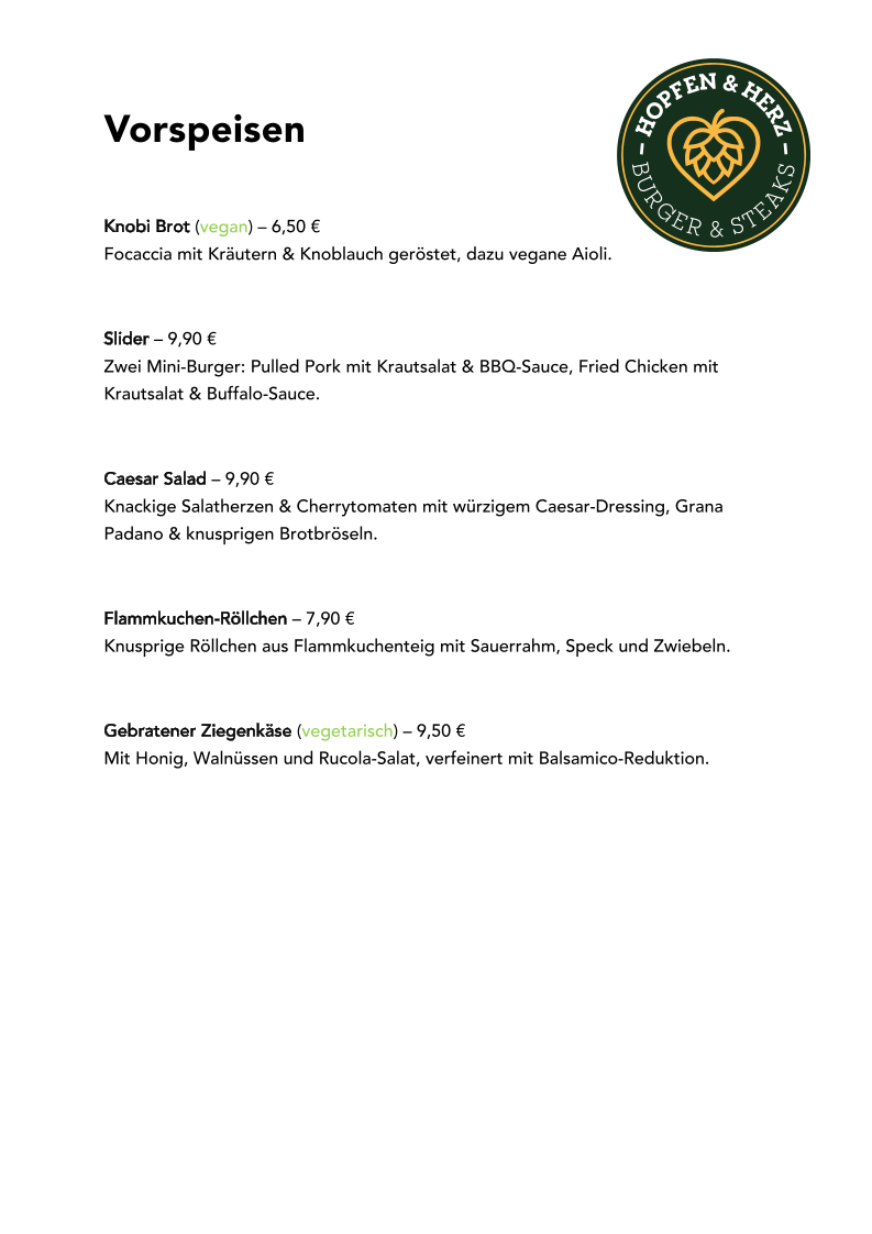 Hopfen & Herz in Wernigerode offers a refined yet approachable menu that balances classic flavors with fresh, quality ingredients. Start with their vegan Knobi Brot, a herb-roasted focaccia paired with a smooth vegan aioli, or dive into sliders featuring pulled pork and crispy fried chicken, each with distinct sauces like BBQ and Buffalo. The Caesar Salad offers crisp greens, juicy cherry tomatoes, and a savory Grana Padano finish, while the Flammkuchen Röllchen delivers a crispy, flavorful bite.
